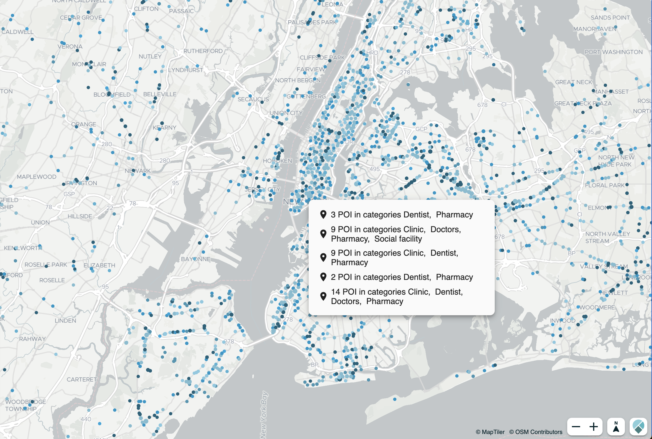To improve the loading time and the MVT response size, our API service clusters the POIs. In other words, it slices the requested tile in multiple, very small areas and gathers the POIs that are in the same area. It only retrieves then one point per area with the mean coordinate of the POIs and the number of POIs that it contains (thanks to the attribute numOfPois of the point).